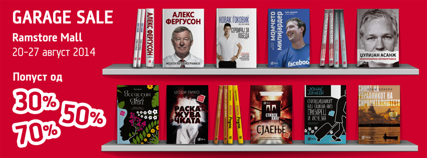Најпопуларните наслови на Арс Либрис (бестселери, биографии, графички романи…) од денеска па до 27 август ќе бидат на попусти од 30%, 50% и 70% на популарниот Garage Sale кој втора година по ред се одржува во Ramstore Mall.