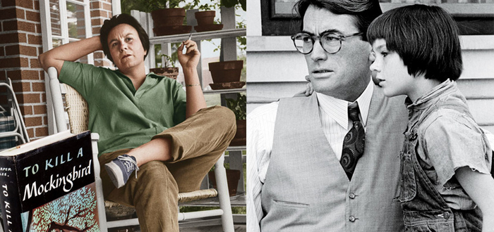 Лево: Харпер Ли. Десно: Грегори Пек во филмуваната верзија на романот „Да се убие птицата подбивница“
